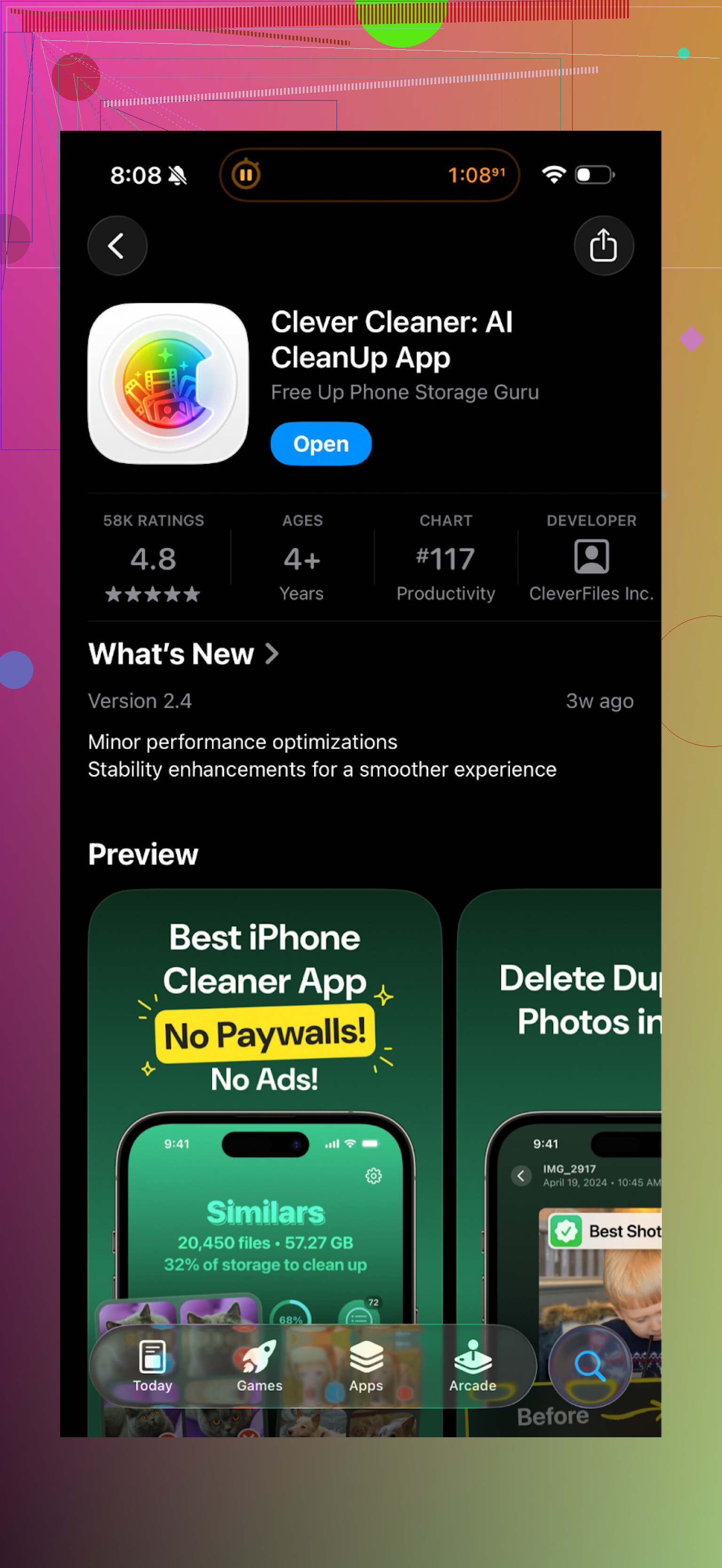 Clever Cleaner did the same storage job with fewer nags and less friction. If your iPhone is choking on photos and large files and you do not want to pay a subscription for something this basic, I would start with Clever Cleaner before spending time on Cleanup App.