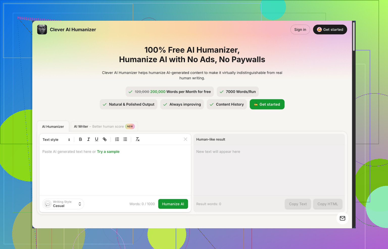 ほかの「人間らしくする」系ツールで、文字数制限や有料クレジットにうんざりしていたときに Clever AI Humanizer — Best 100% Free Humanizer を見つけました。