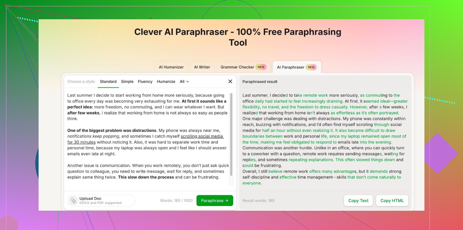 I agree with @mikeappsreviewer that Clever Ai Humanizer works fine for paraphrasing, especially if you want more words per day without paying. I would not rely on any paraphraser to “fix” similarity by itself though. Turnitin and similar tools often still see the structure of your sentences and the order of your ideas.