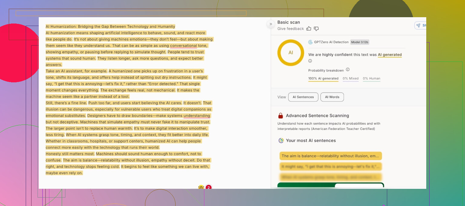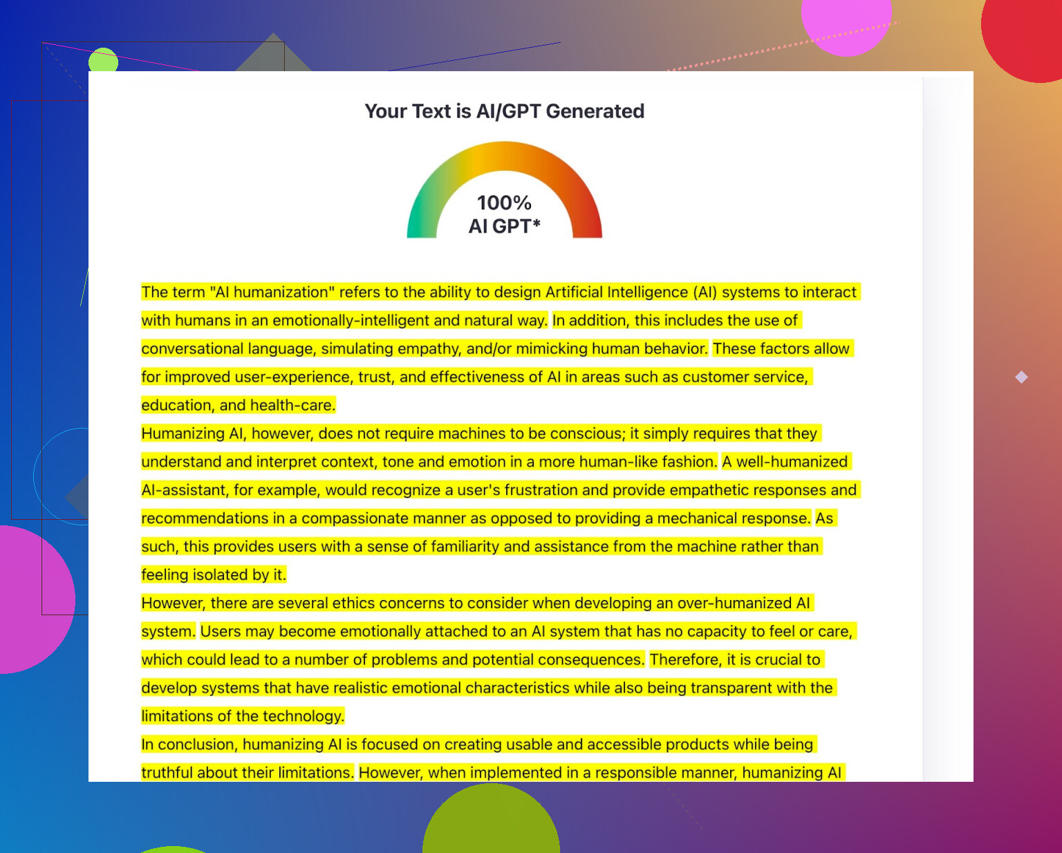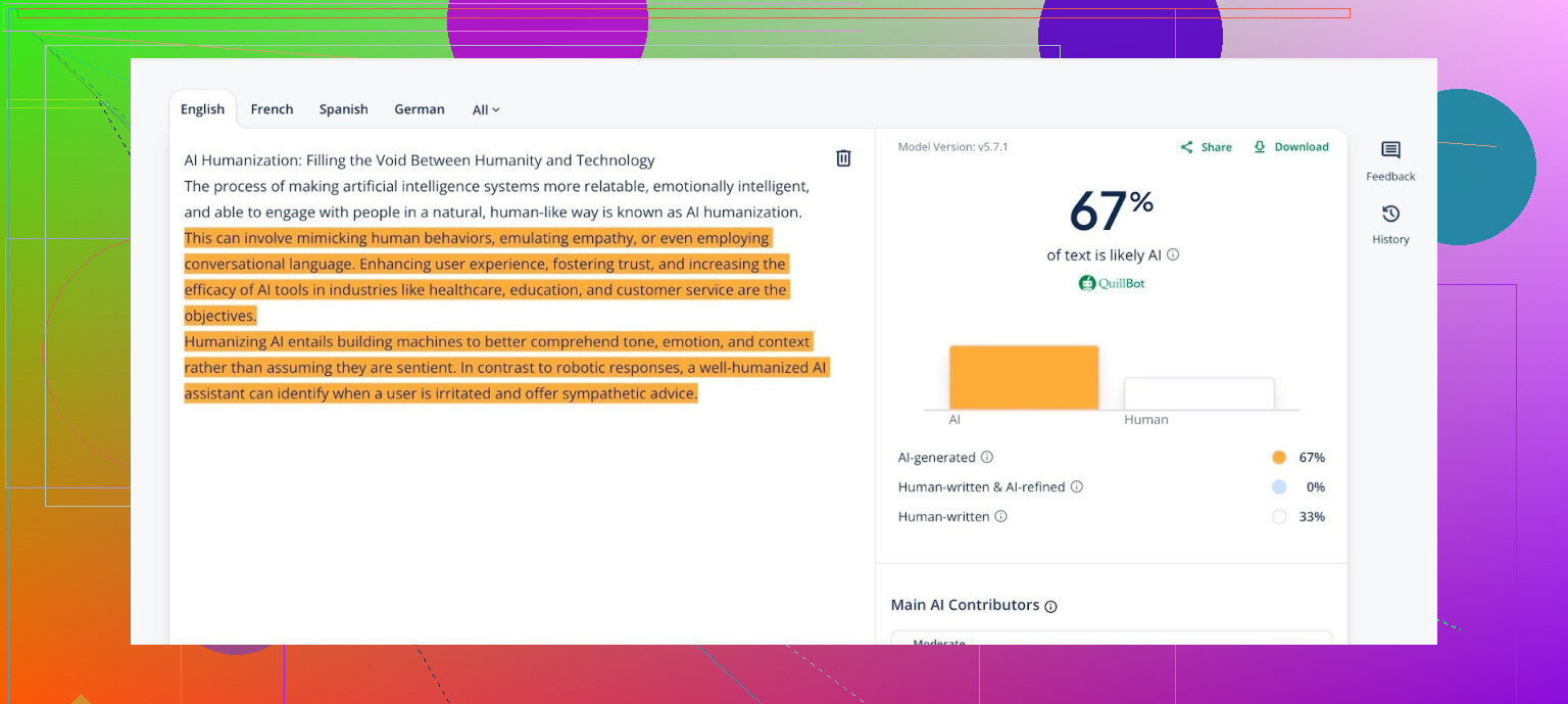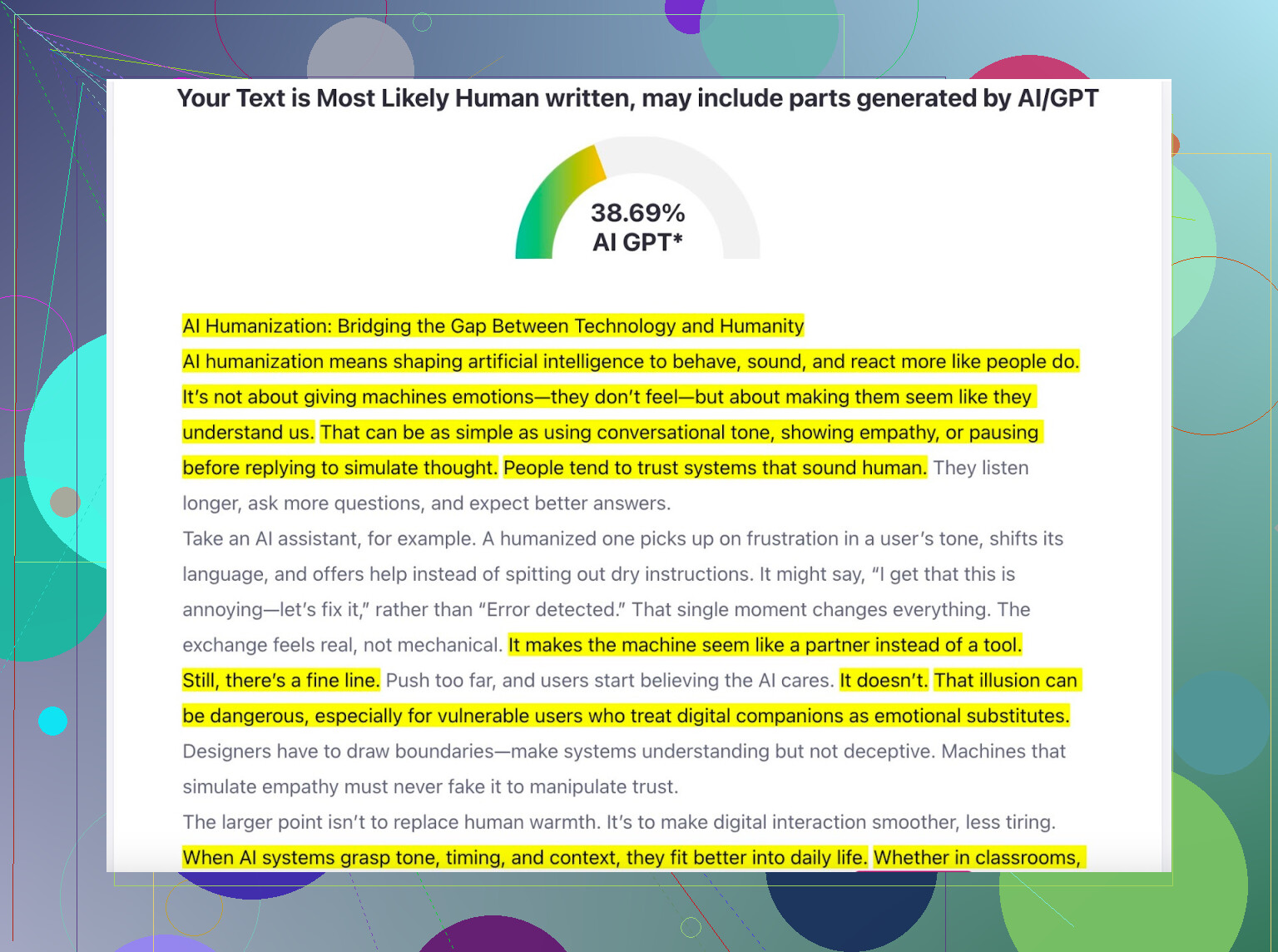 Spoiler : Leur propre détecteur identifie leur texte comme étant de l’IA. Aïe. Honnêteté ou négligence, peu importe — si tu comptes dessus pour tromper les vérifications, c’est raté.