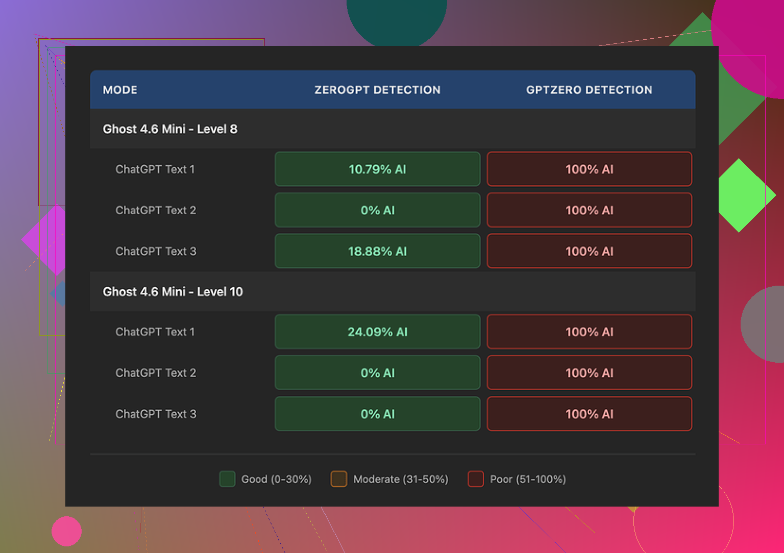 • GPTZero flagged all outputs in their tests, even on lower “intensity” and on both engines.