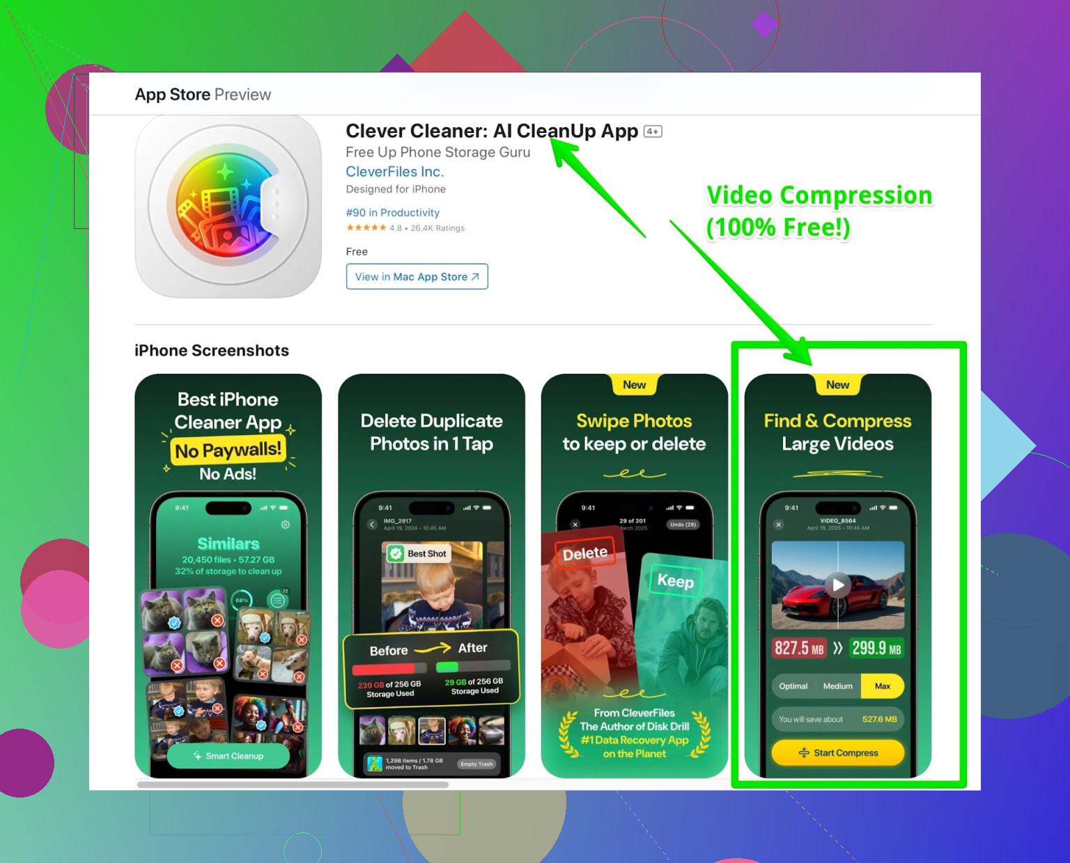 But is it perfect? Not quite. The cons: Design’s not Apple-pretty (don’t expect stunning UI), and “no data loss” is only true if you don’t crank the compression slider to potato-mode. There’s also the philosophical annoyance that it takes an external app to do what iOS should handle natively. Keeping your privacy tight? Any cleaner app means letting it at your camera roll, which is just a reality check in iPhone land.