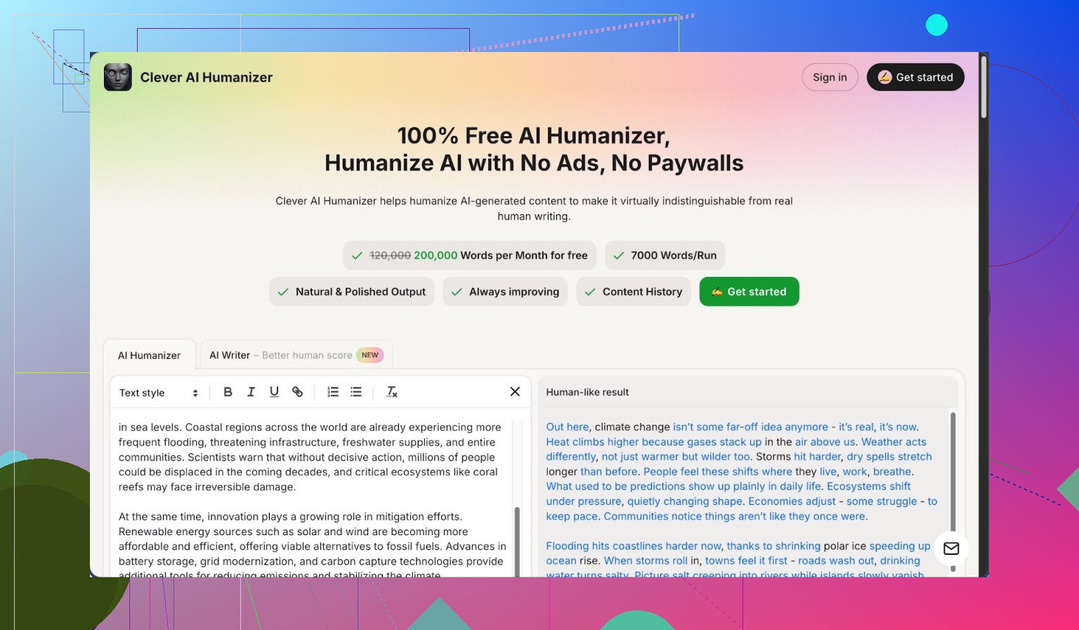 Most tools pretend to be free then freeze you around 150 to 300 words until you plug in a card. Clever AI Humanizer gives you 200,000 words every month free, with a 7,000 word limit per run. That 7k number is the highest I hit anywhere.